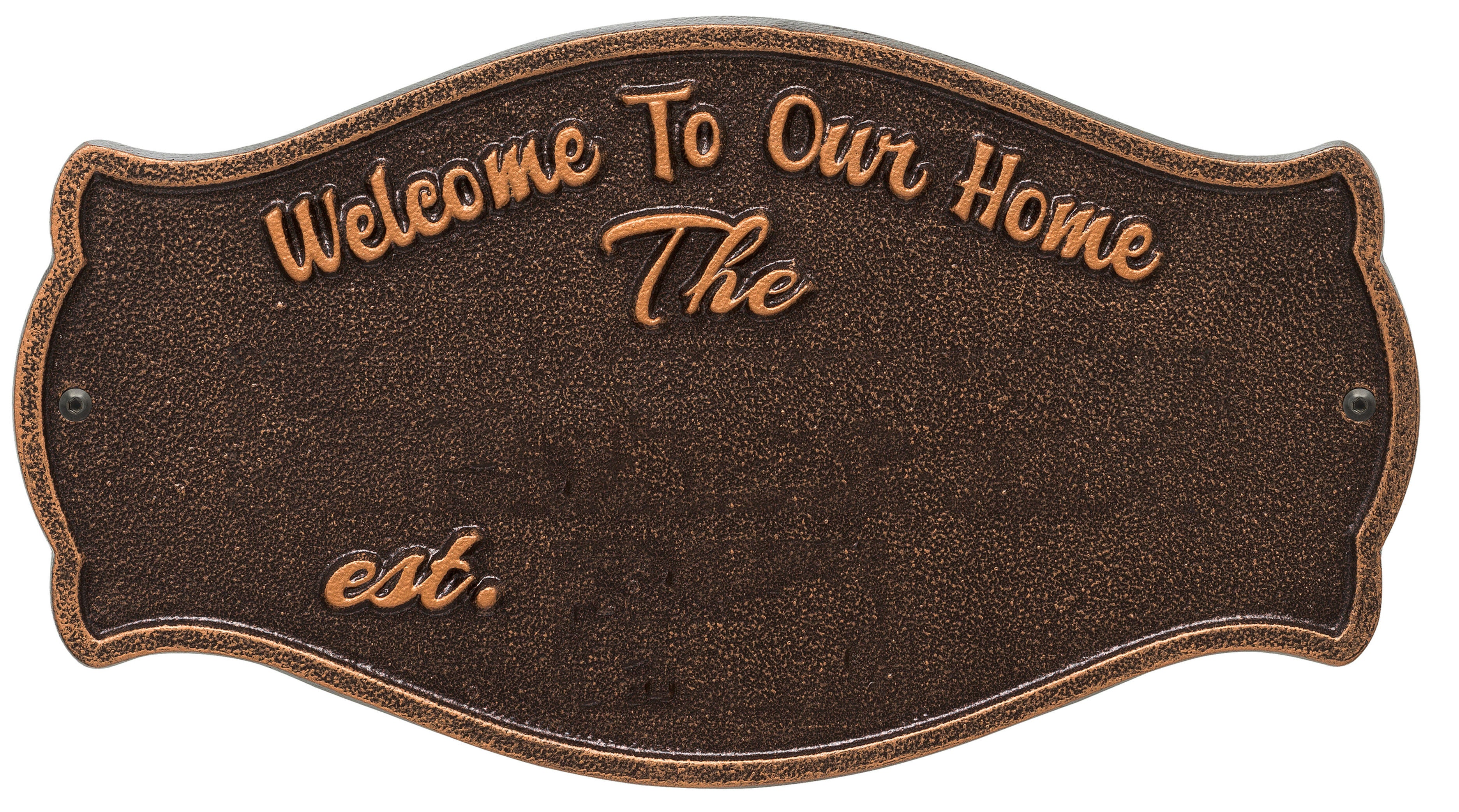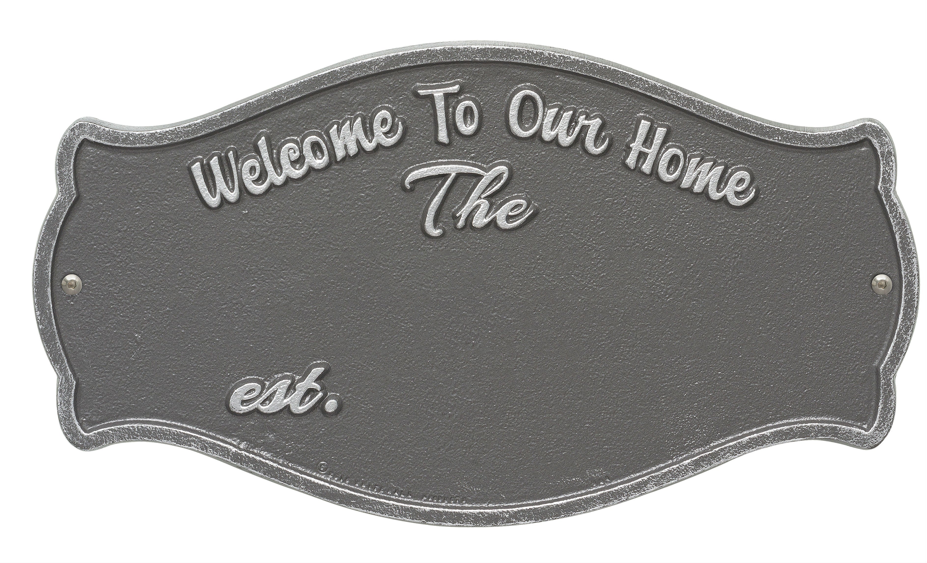 Welcome Plaque displays Welcome To Our Home, name, and established date. Made in USA from handcrafted aluminum. 15" L x 8.5" W x .32" D.