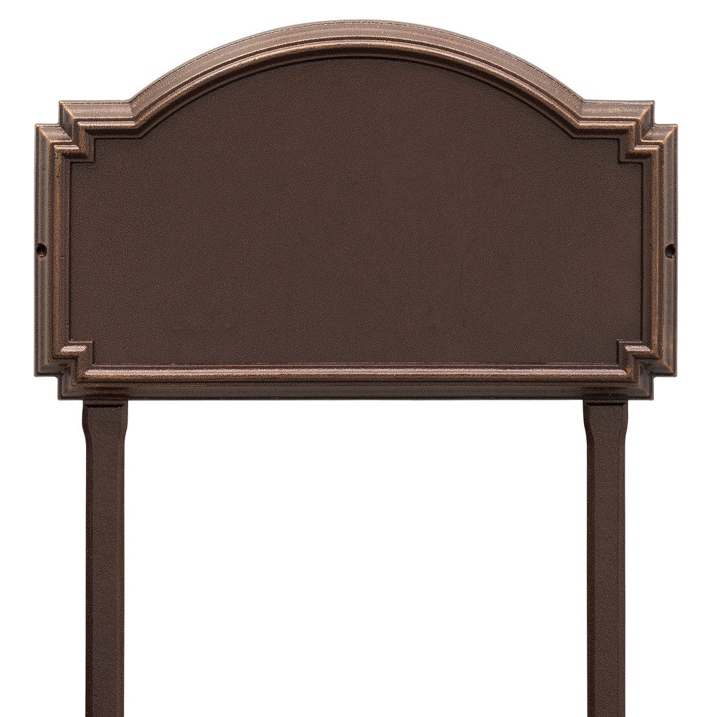 Chic estate address plaque with arched top and decorative border. Made in USA from handcrafted aluminum. 20.5" x 12". Holds up to five 5.5" numbers. For lawn mounting with included stakes.