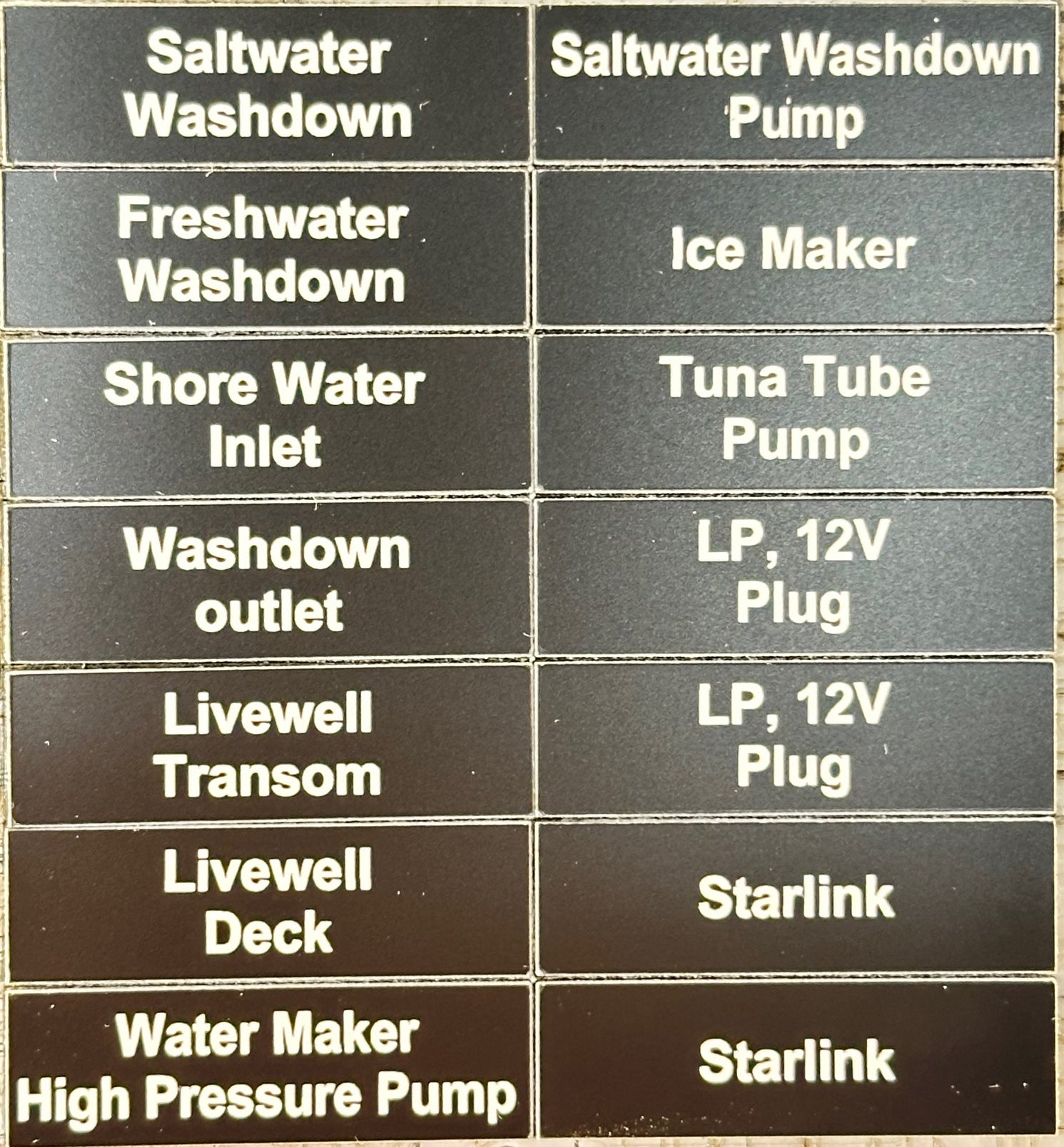 Small, custom laser engraved label 1.44"W x .44"H. Color black with white characters. Engraved on 1/32" thick acrylic plastic with self adhesive back. For indoor or outdoor use.