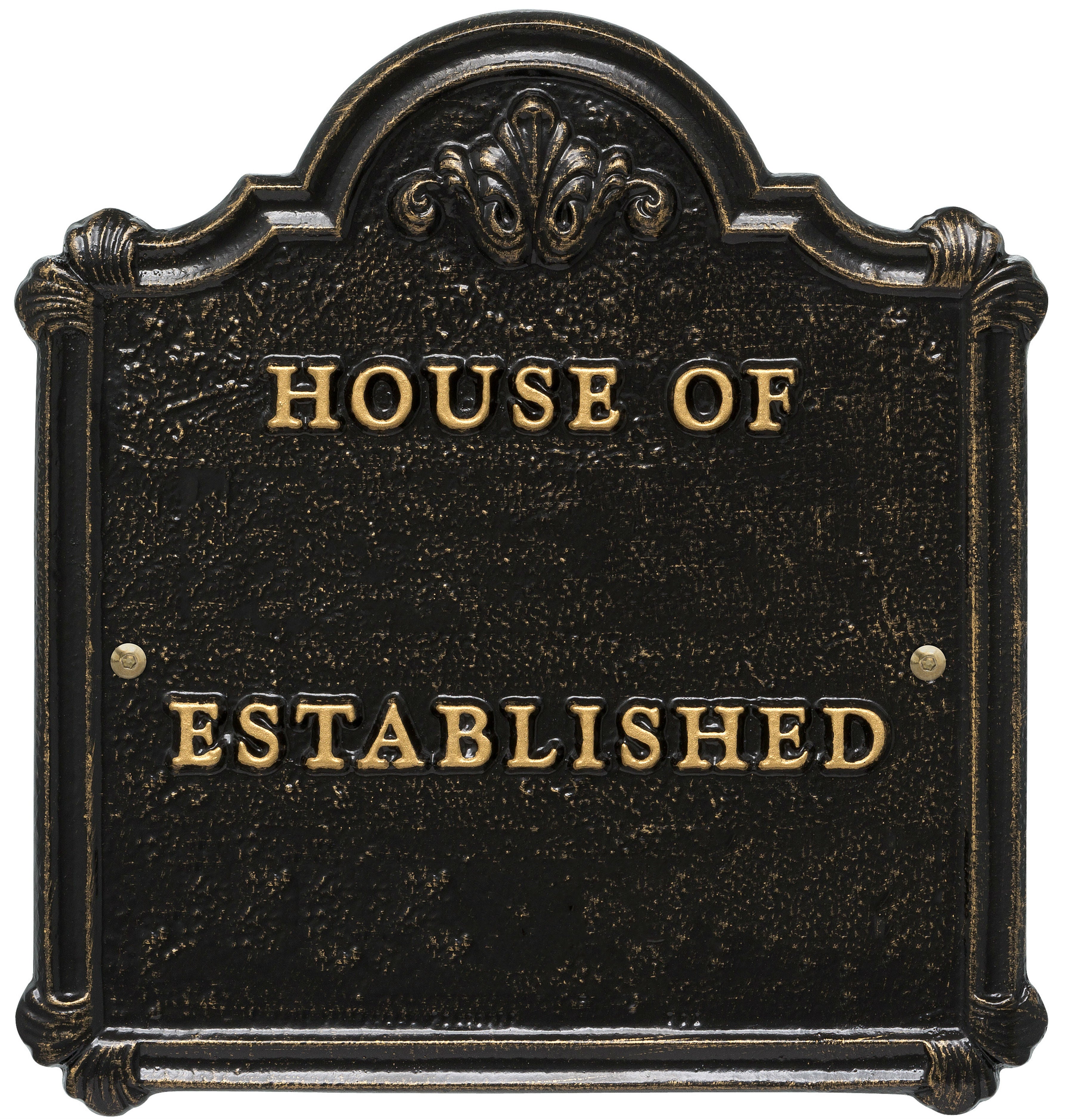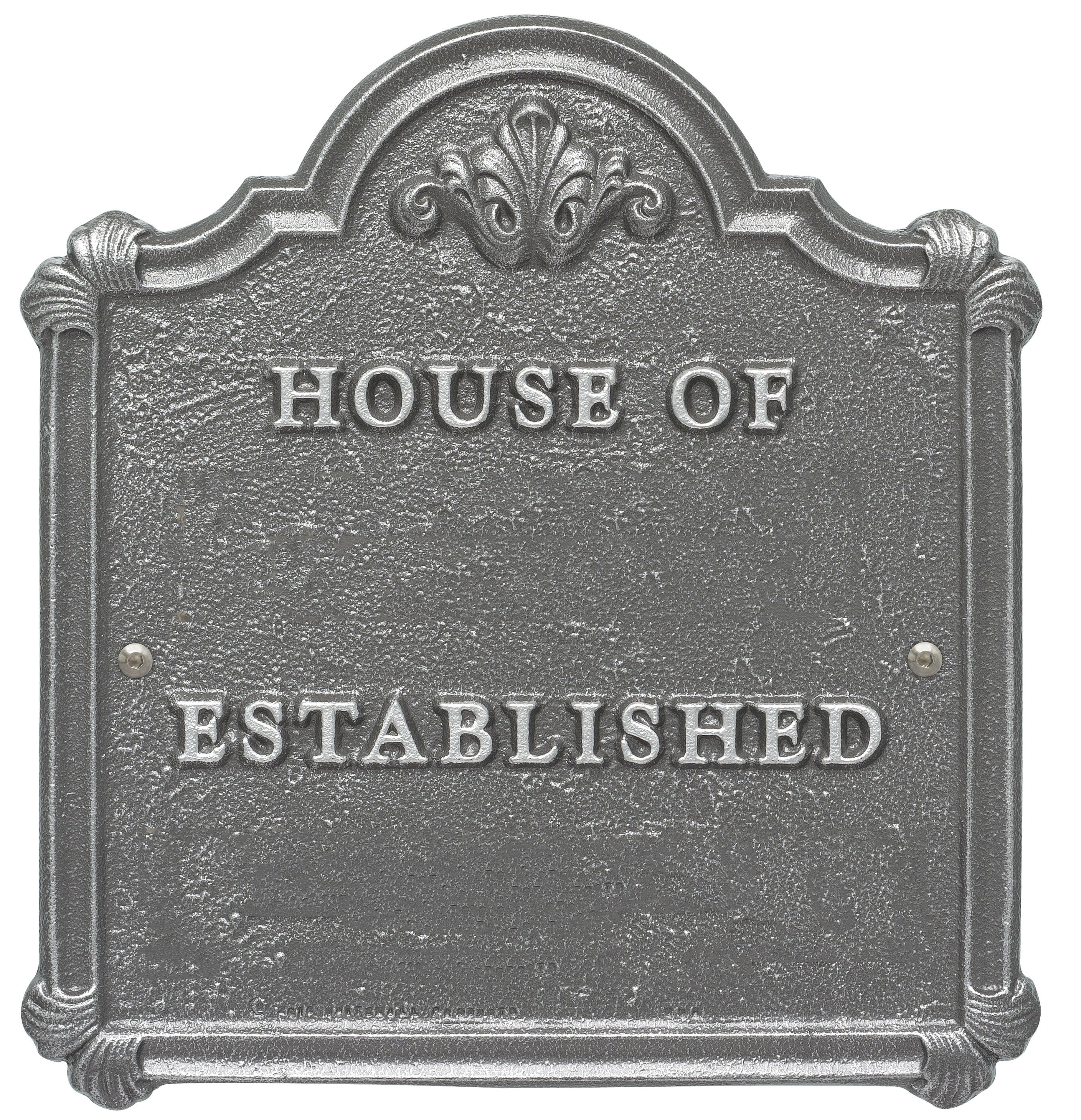 House of Plaque with Established Date is made in USA from handcrafted aluminum. 10.8" L x 11.5" W x .32" D.