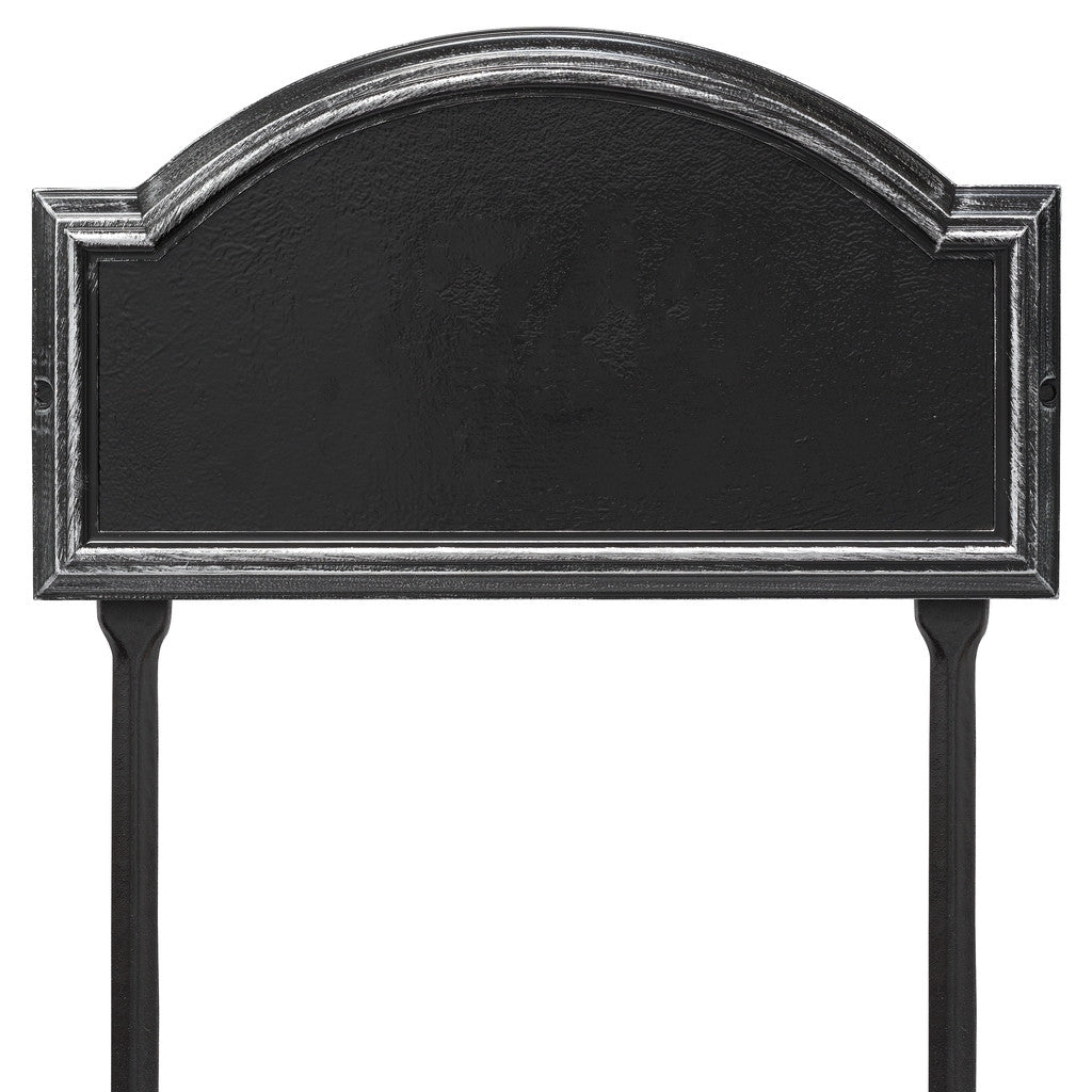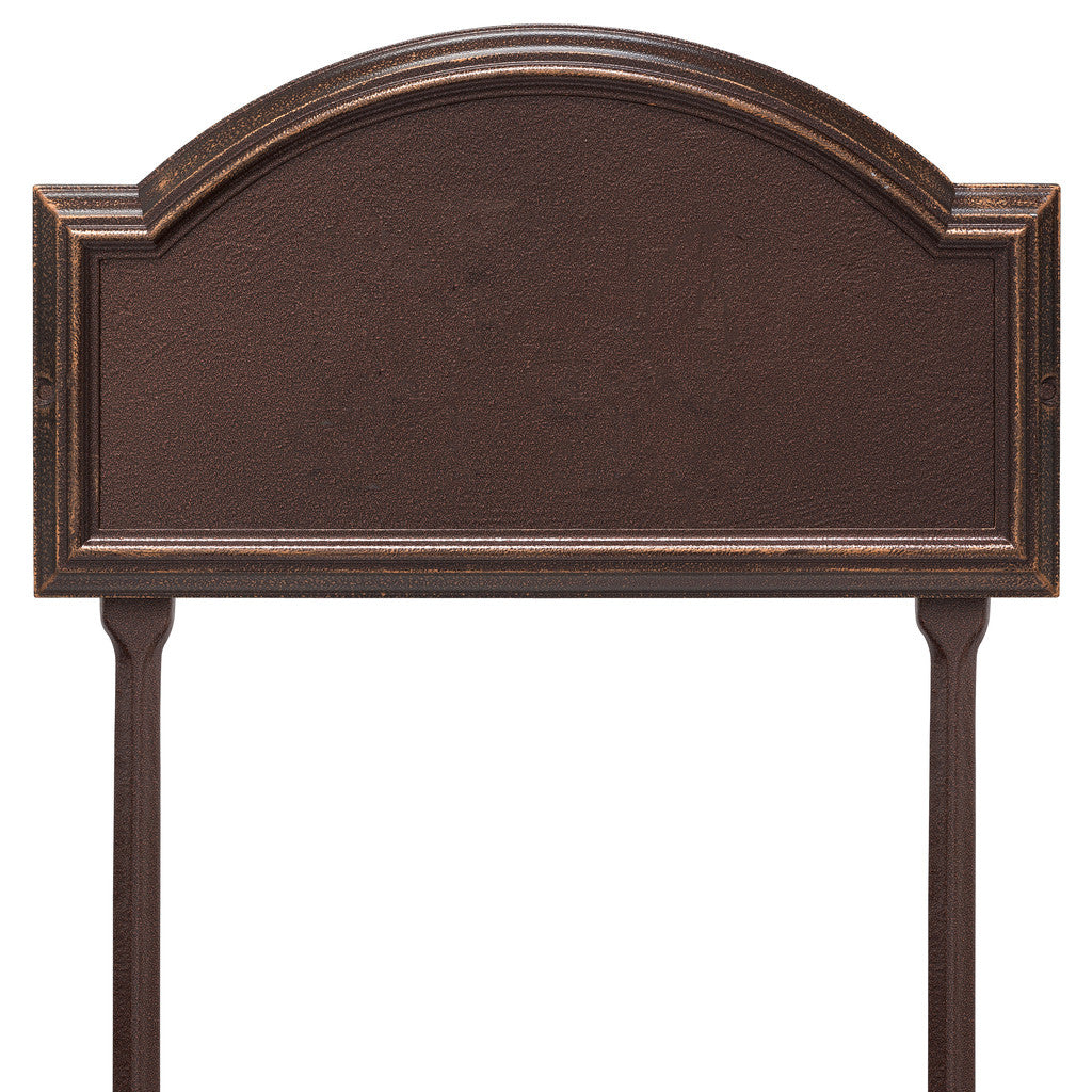 Sophisticated address sign with arched top and decorative border displays two lines. Made in USA from handcrafted aluminum. 17" x 9.5" x .375". For lawn mounting with included stakes.