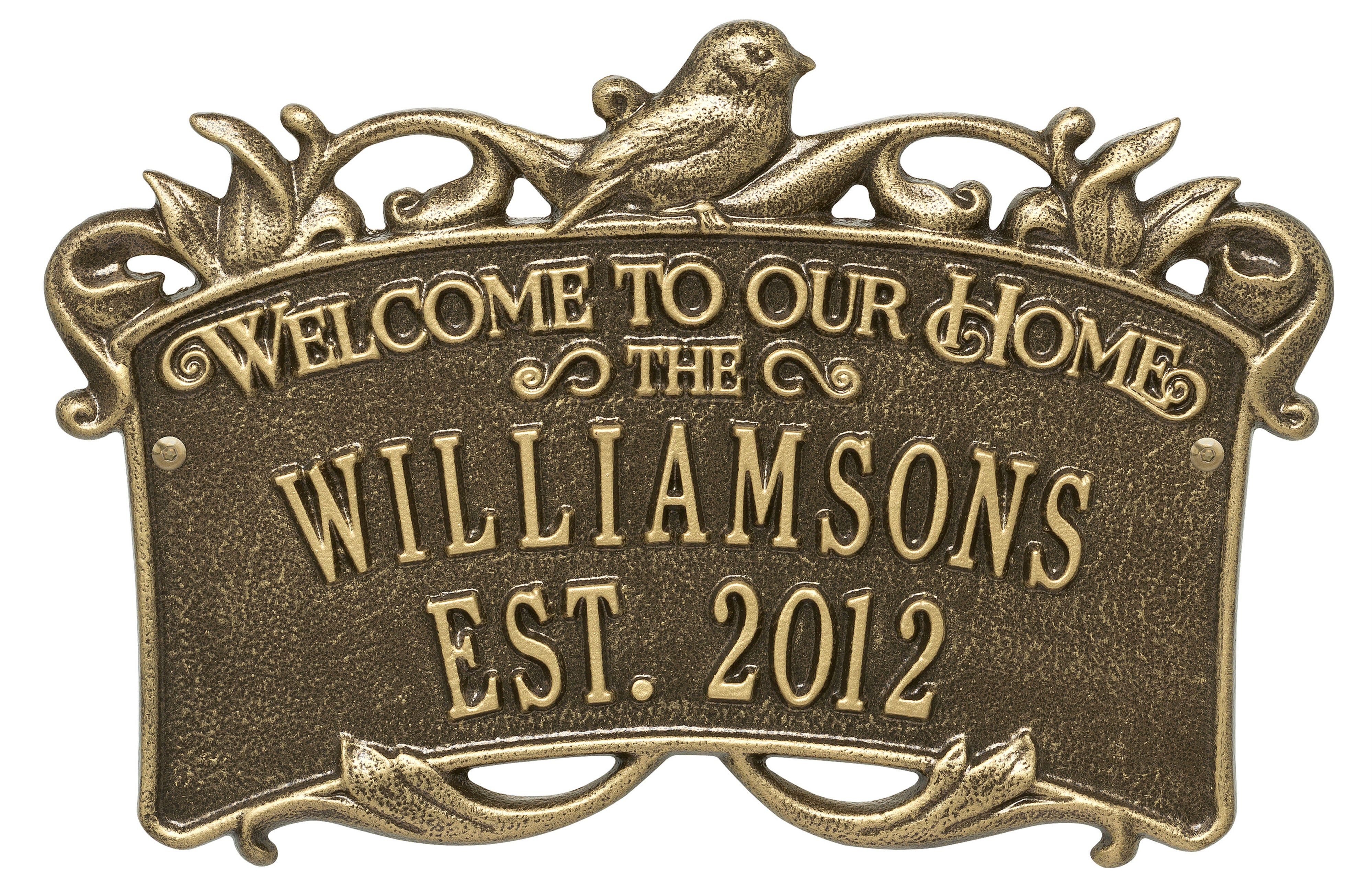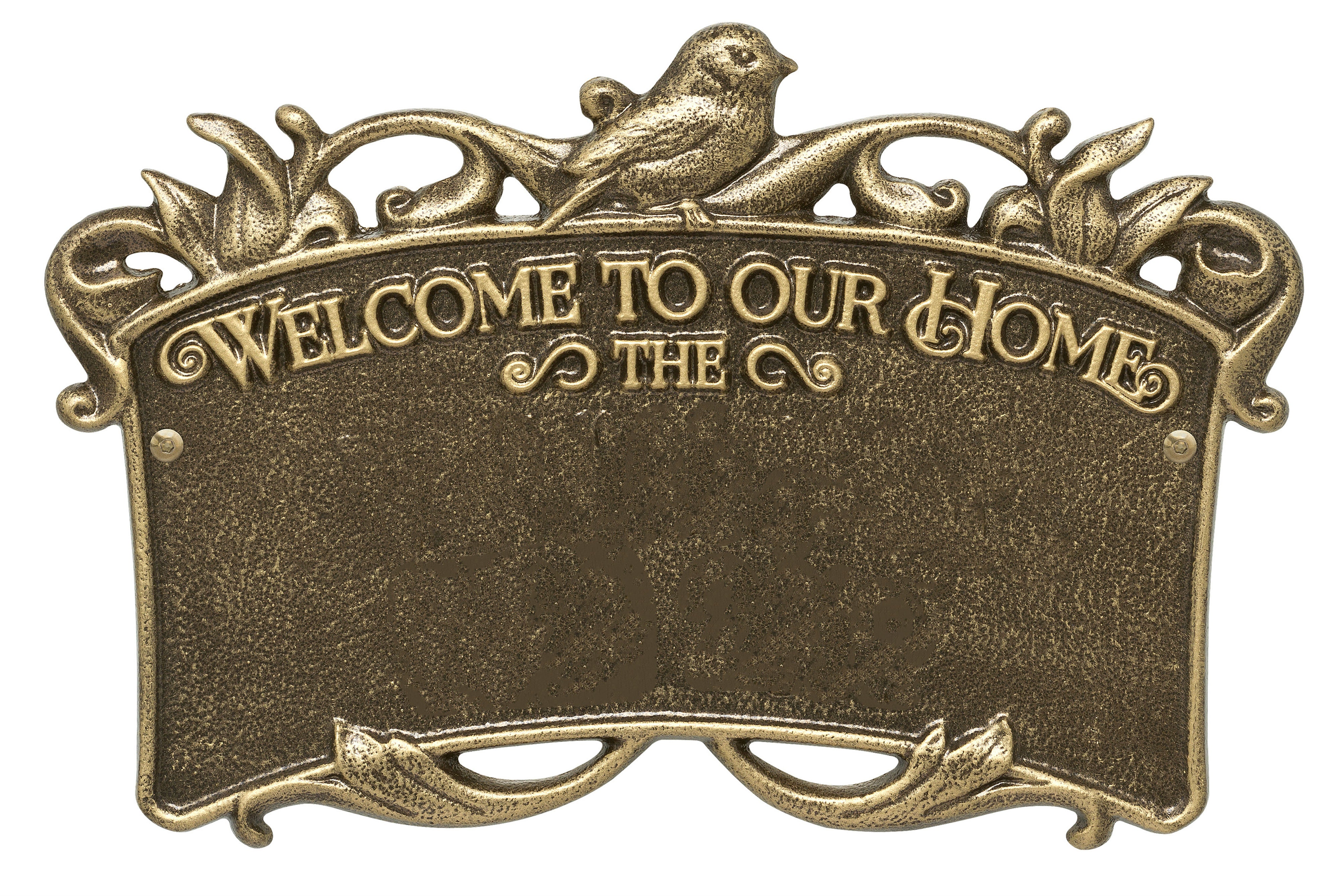 Welcome to Our Home Plaque with songbird at top is made in USA from handcrafted aluminum. 14.25 L x 9.5" W x .34" D.